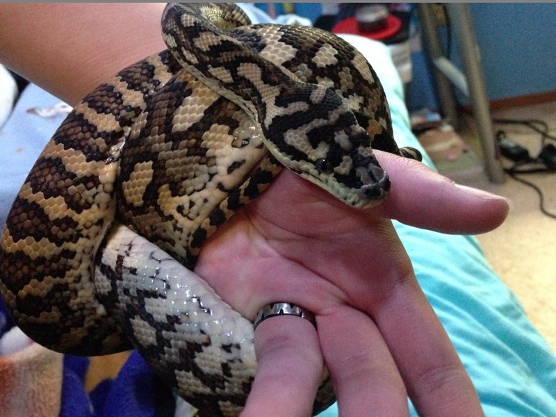 First time holding my new carpet since I brought her home... She chose to constrict my hand. I think someone's hungry.