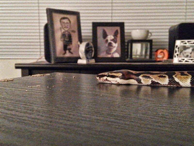 Making his(?) way across a broken down bookshelf I was throwing out.