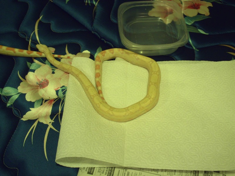 Toby my Coral Albino PH Snow male on my bed, while I finish cleaning his cage
