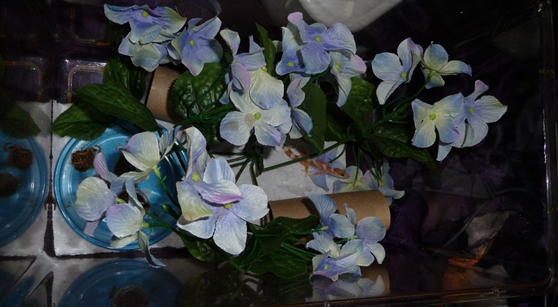 This is the full set up, some TP rolls, a fake plant, and a dish of CGD and mealworms.