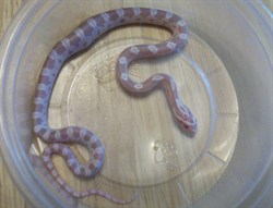 Comments: #1 of 5 pink babies out of my female Snow and my male Amel/Sunglow Corn Snake. This was their first clutch and my first attempt at breeding. Snow White laid 9 eggs and all hatched.