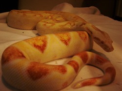 Comments: Rayza is an awesome Sharp albino, he's real colorful, tame as a kitten and the BEST breeder I have. He bred a hypo female for me and then went on loan to breed a hog island female too. I dont think the hypo female took, I didnt give him enough time with her, but the hog female in due July 12th. I'm pretty sure his babies will be the first ever 50% hog 100% het Sharp albino. The final goal in that project will be sunset sharp sunglows.... Imagine?